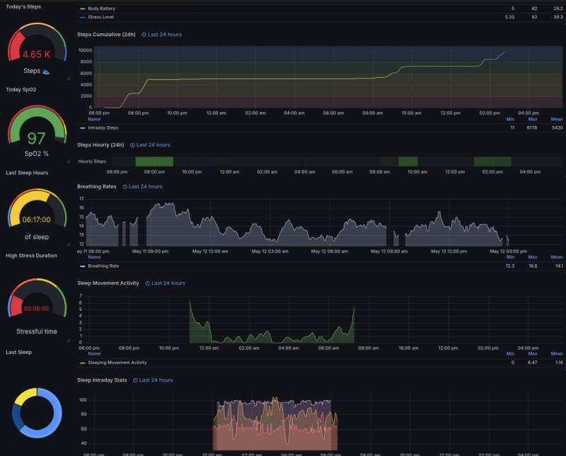 - 全面的数据指标:Garmin Grafana 支持收集多种健康指标,包括心率、步数、睡眠数据、压力水平、身体电量等,为用户提供了全面的数据支持。